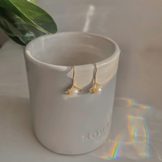 Sidabriniai auksuoti kabantys auskarai su tikru perlu