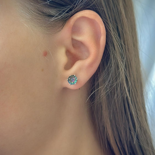 Sidabriniai rodžiuoti užsukami auskarai su alyviniu cirkoniu