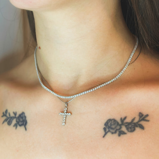Sidabrinis rodžiuotas kryželis su cirkoniais ir grandinėle