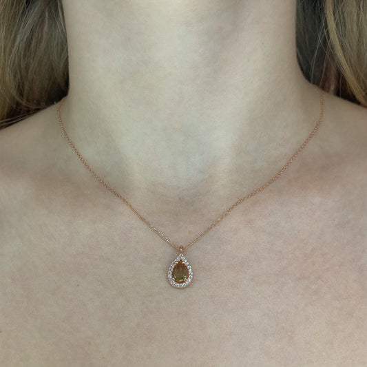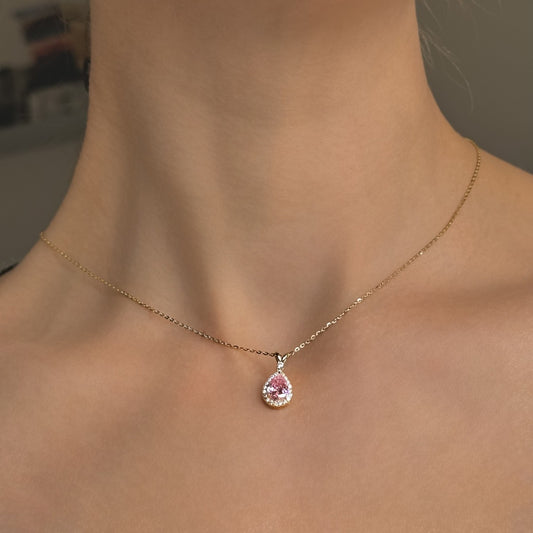 Auksuotas sidabrinis lašo formos pakabukas su rožiniu cirkoniu ir grandinėle