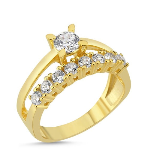 Dvigubas sujungtas sidabrinis auksuotas žiedas su 1 eil. cirkonių