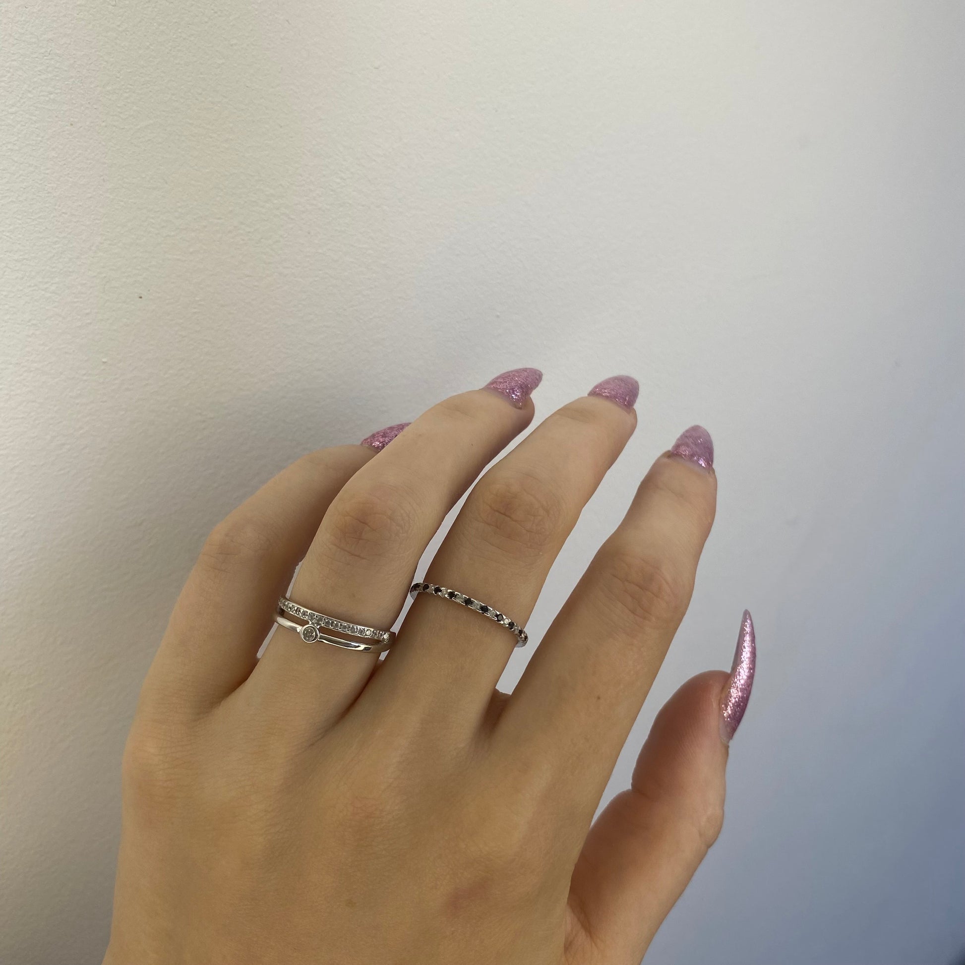 Dvigubas sujungtas sidabrinis rodžiuotas žiedas su cirkoniais