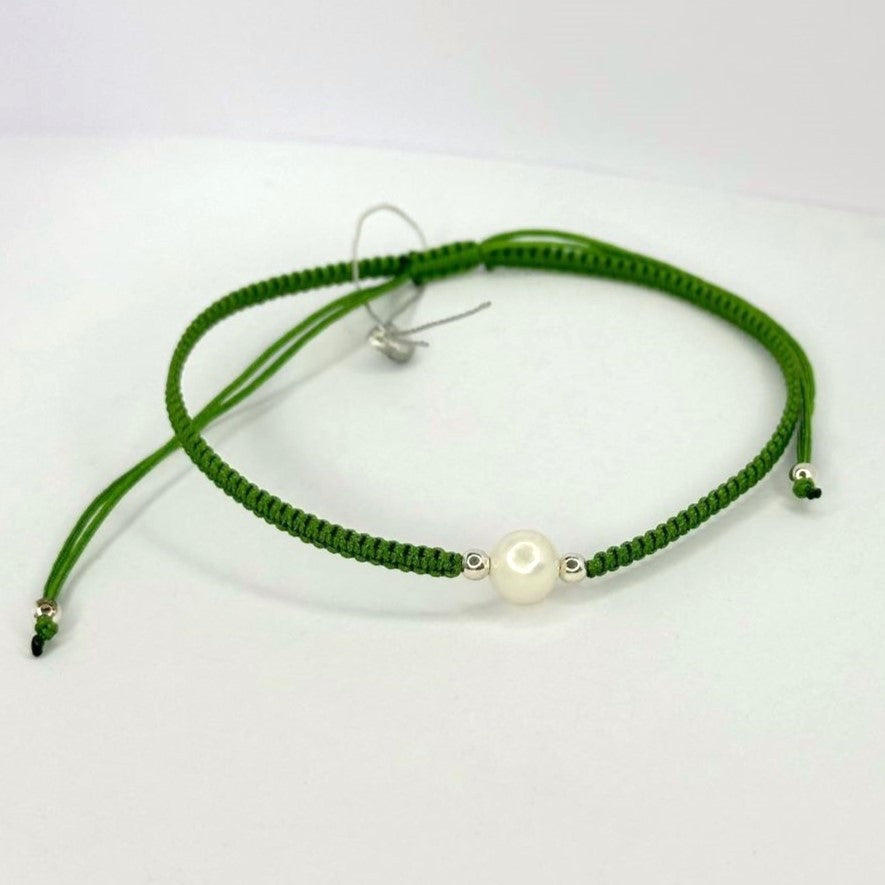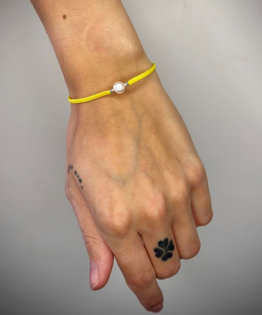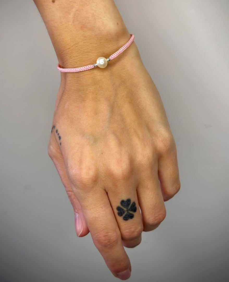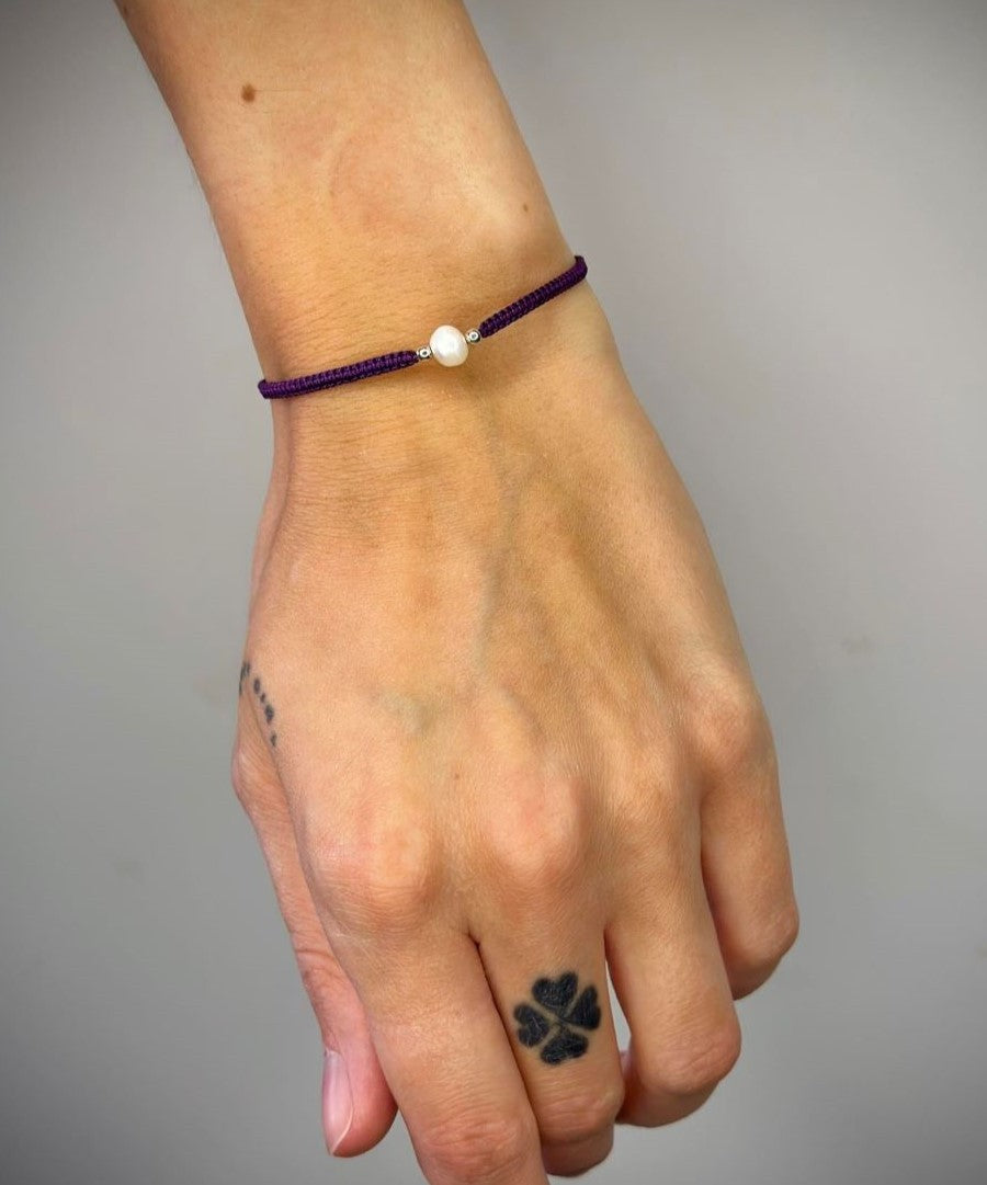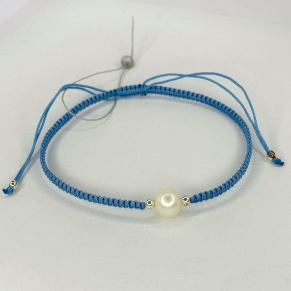 Įvairių spalvų siūlo apyrankės su tikru perlu ir sidabriniais karoliukais
