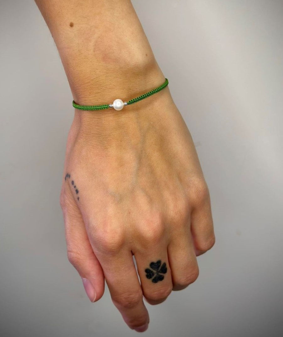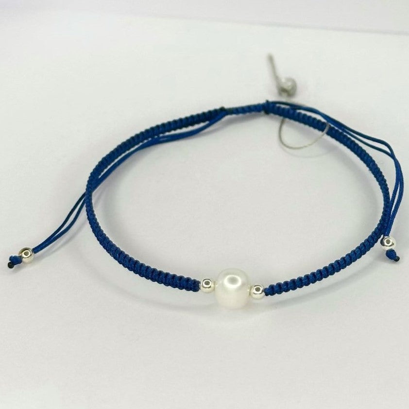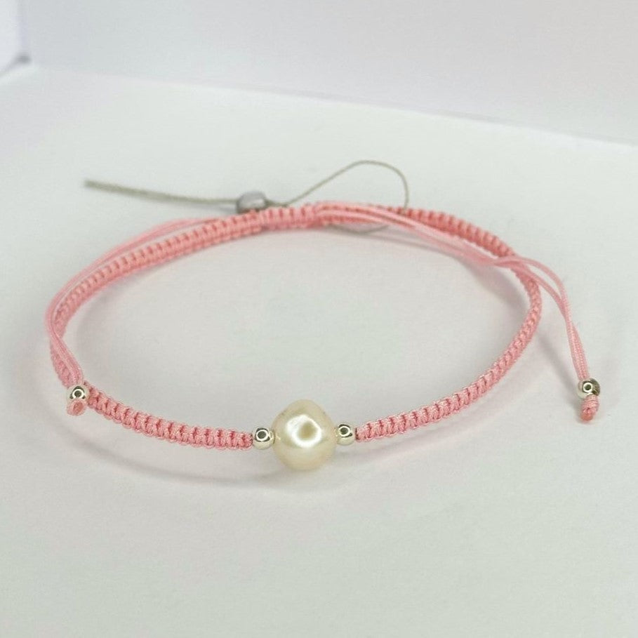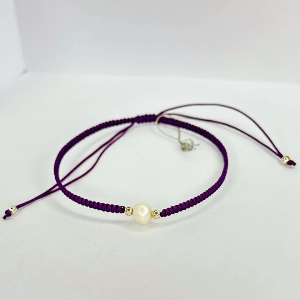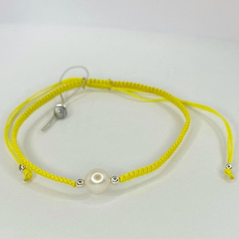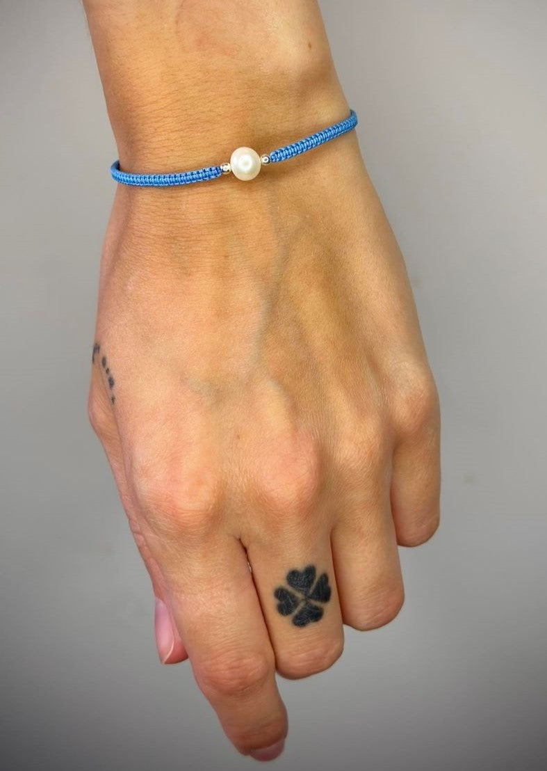 Įvairių spalvų siūlo apyrankės su tikru perlu ir sidabriniais karoliukais