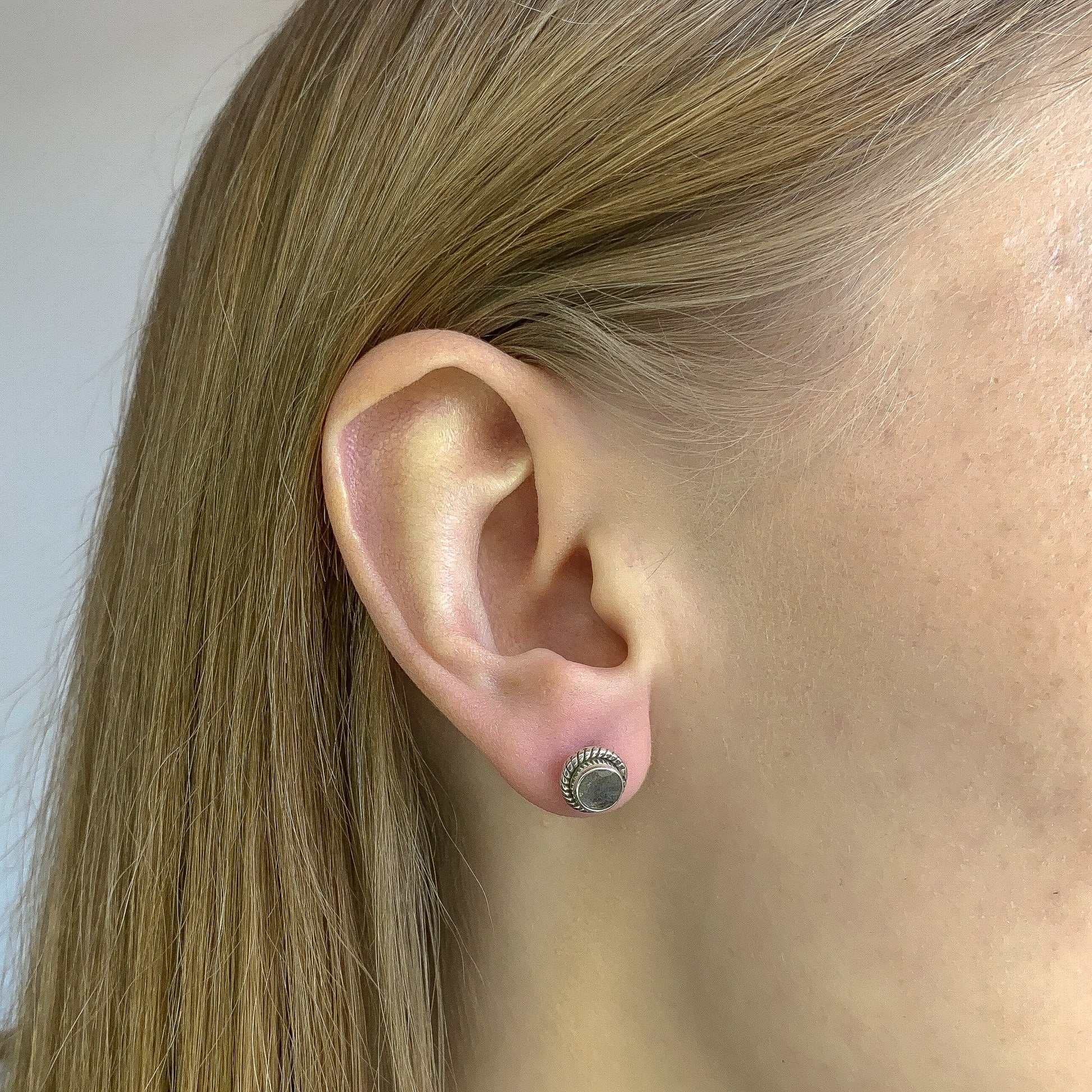 Sidabriniai apvalūs auskarai su labradorito akmeniu