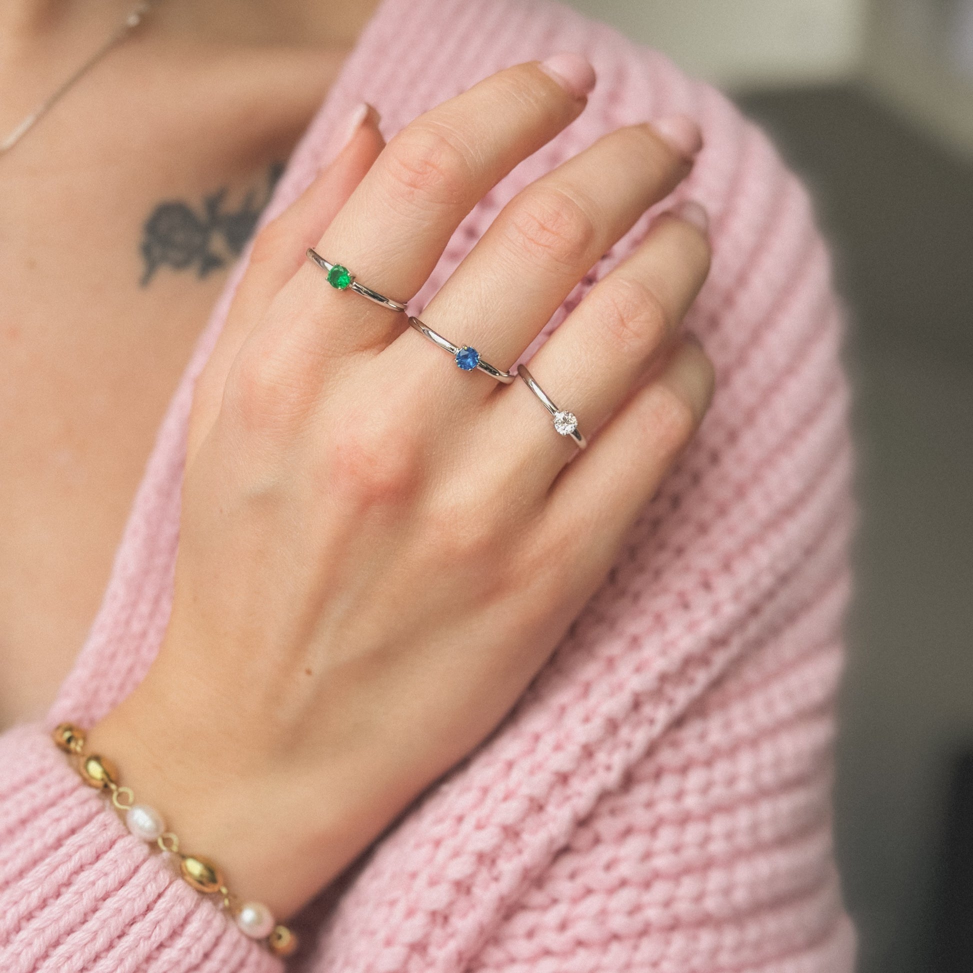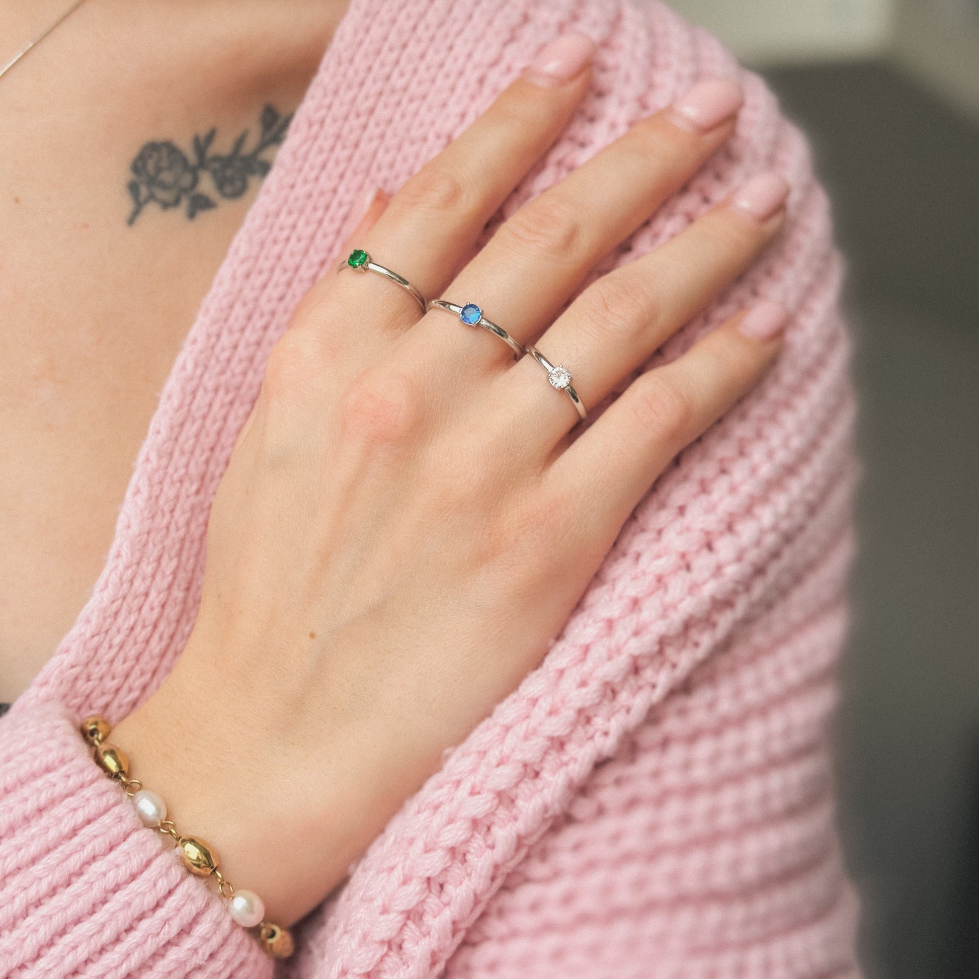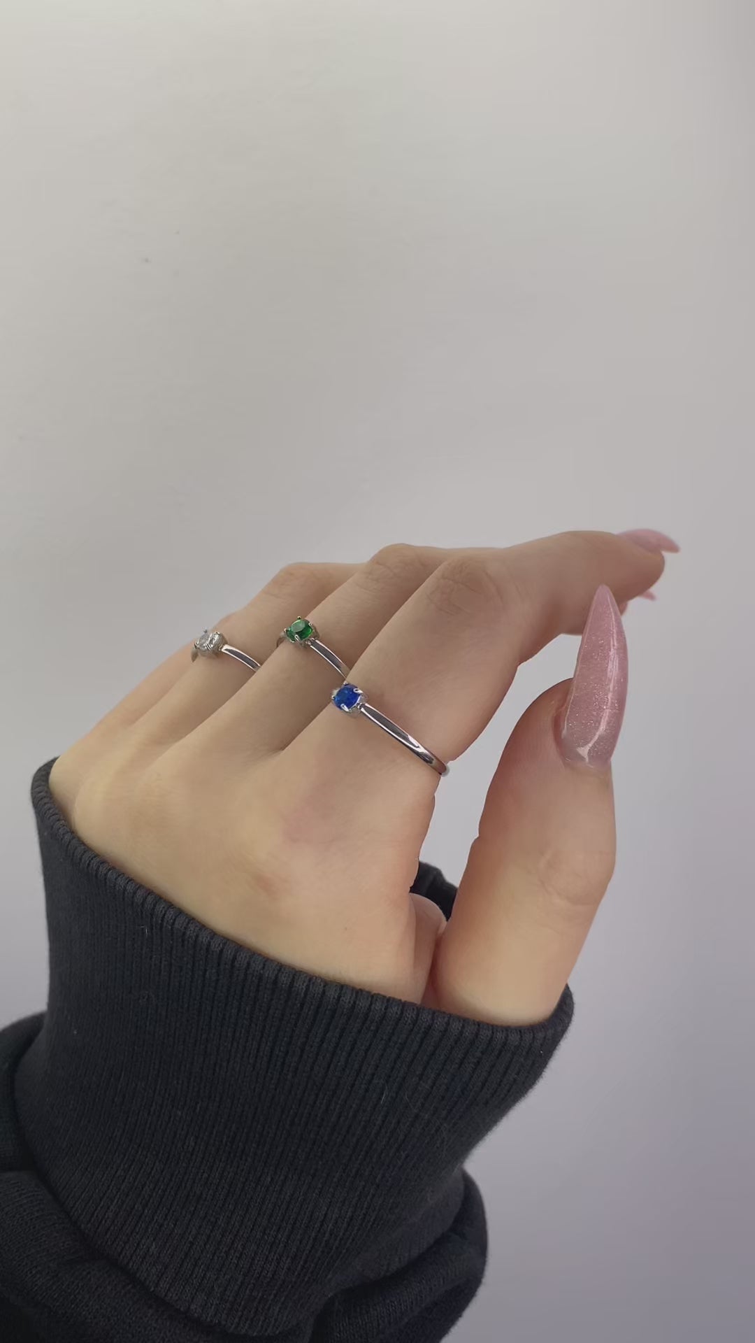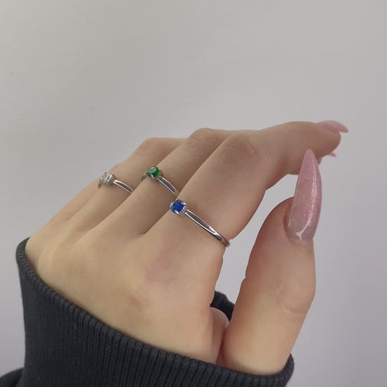 Akmuo: žalios, mėlynos arba baltos spalvos cirkonis.