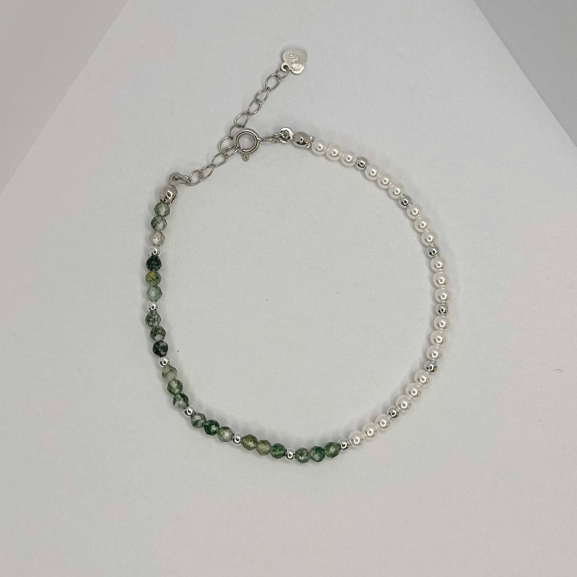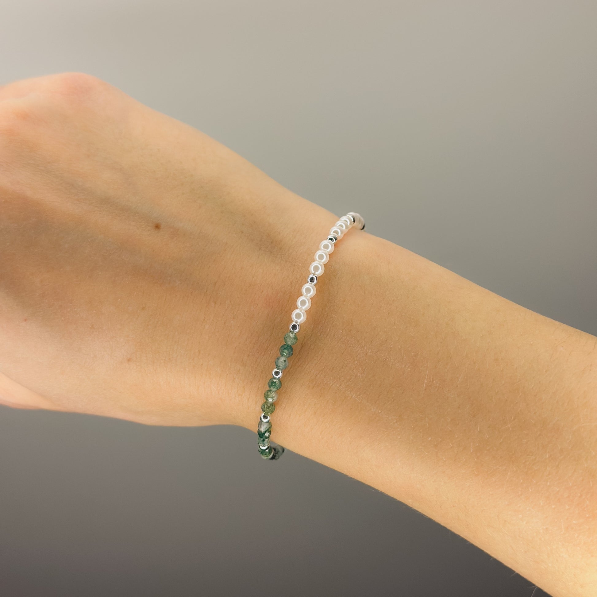 Apyrankė dekoruota 3 mm netikrais perlais ir natūraliais akmenimis.