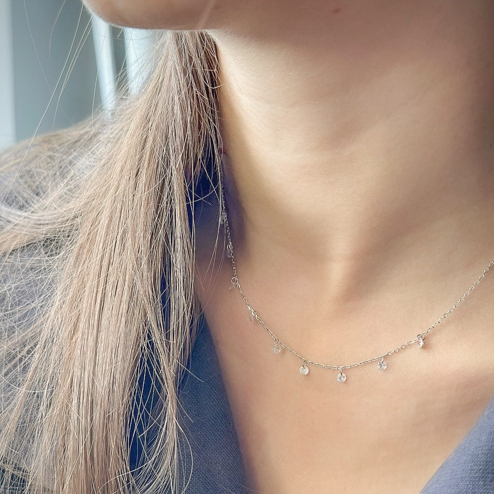 Sidabrinė rodžiuota kolje su kabančiais cirkoniais