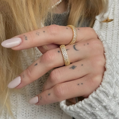 Sidabrinis auksuotas žiedas su 3 eilėmis cirkonių