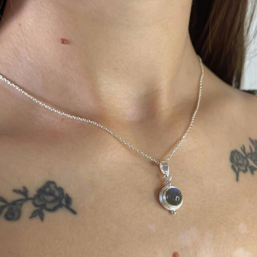 Sidabrinis pakabukas su apvaliu labradorito akmeniu ir grandinėle