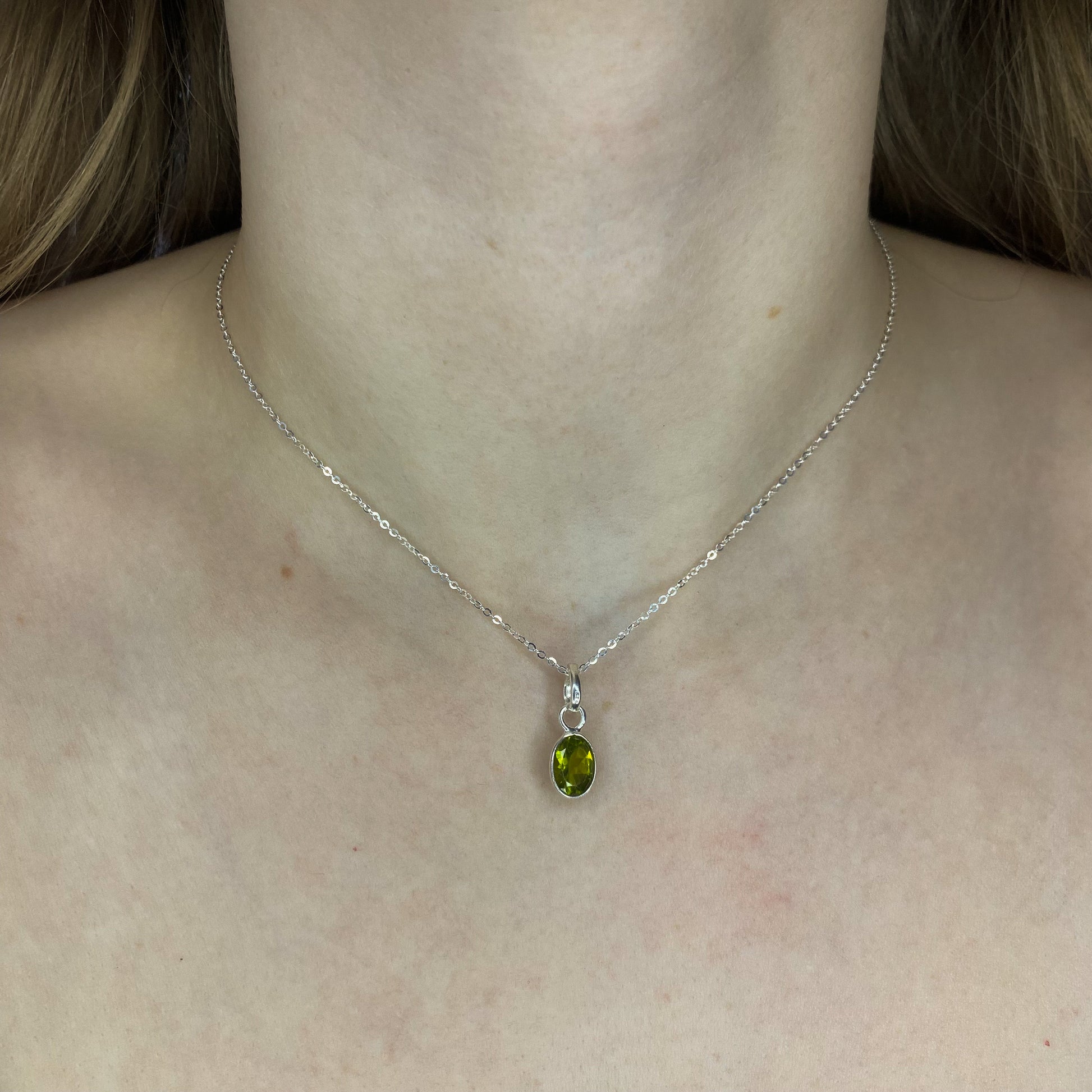 Sidabrinis pakabukas su ovaliu peridotu ir grandinėle
